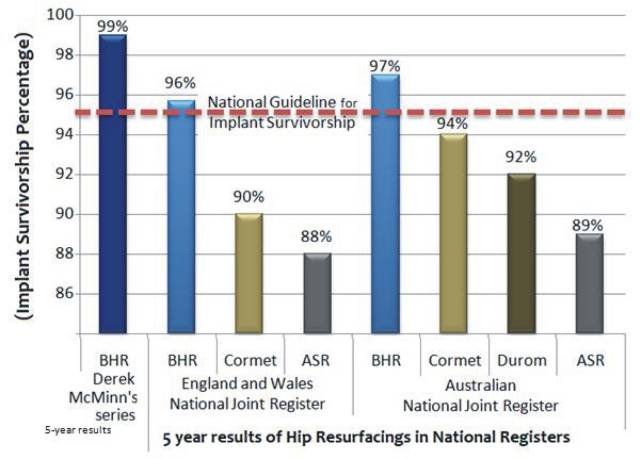 The Australian and the UK National Joint Registers together comprise the largest unbiased documentation of artificial joint devices in the world. The BHR has the longest follow‐up and the largest number of resurfacing cases included in both these Registers. Both these Registers show that BHRs are performing better than the national guideline for excellence in hip replacements.