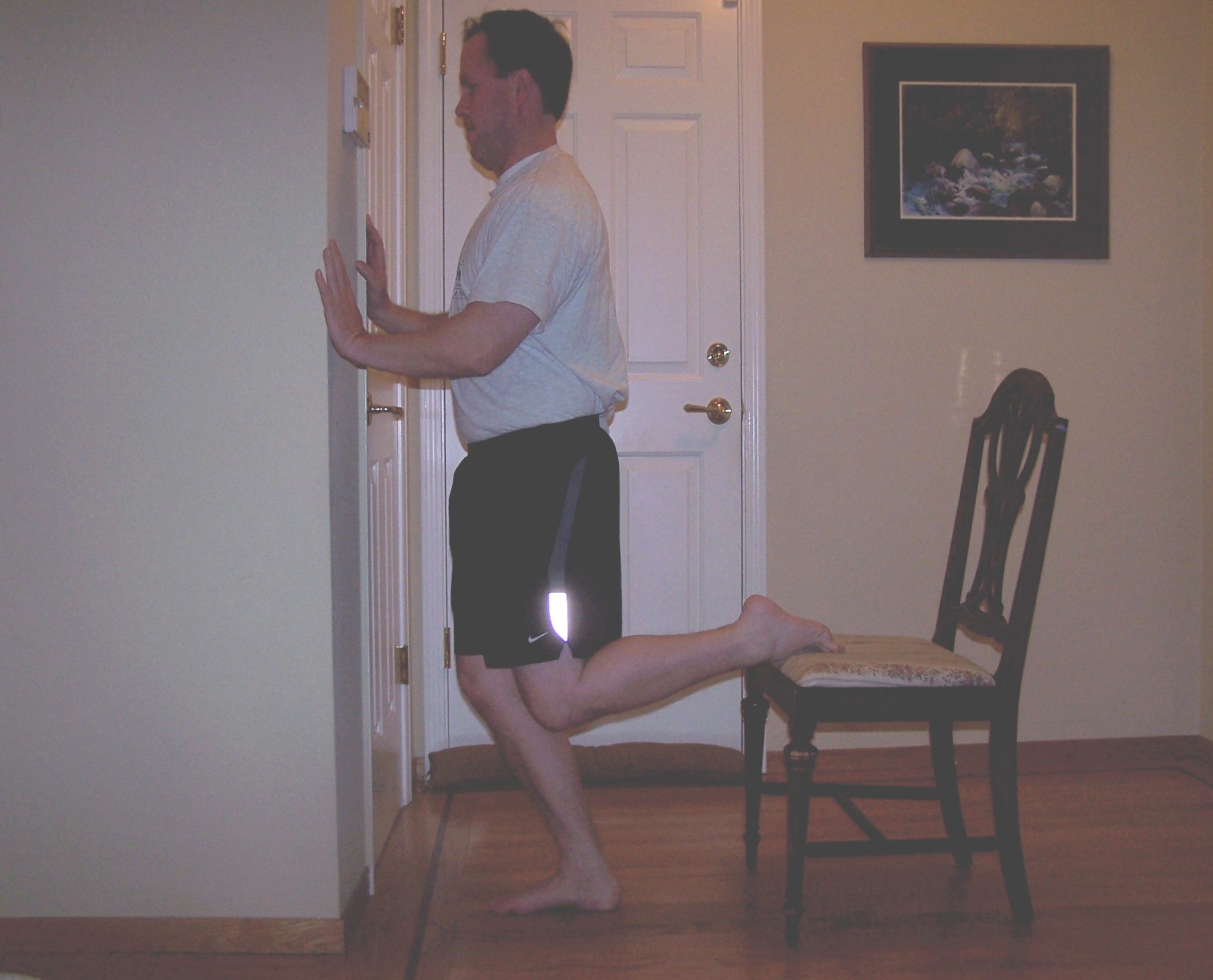 Bend the knee of the operative leg and put the foot on a chair. Tilt your pelvis backward to the “12 o’clock” position by tightening your bottom muscles. Now slowly bend the knee of the leg you are standing on while maintaining the 12 o’clock position in your pelvis and keeping the bent knee in a vertical plane. You should now feel a stretch in your thigh muscle. Hold for 20-30 seconds. You can facilitate further stretching by increasing the bend of the knee you are standing on or tilting your pelvis back further to the “12 o’clock” position.
